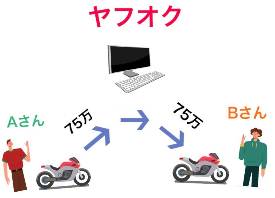 BさんはAさんのバイクを現状のまま店頭販売より安く購入、後日名義変更が必要。