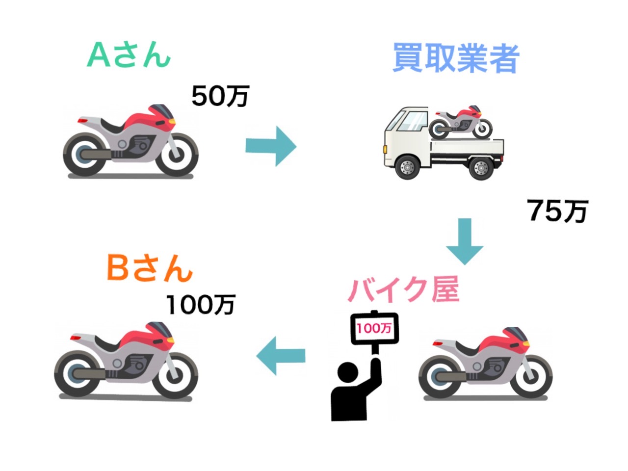 BさんはAさんのバイクを現状のまま店頭販売より安く購入、後日名義変更が必要。